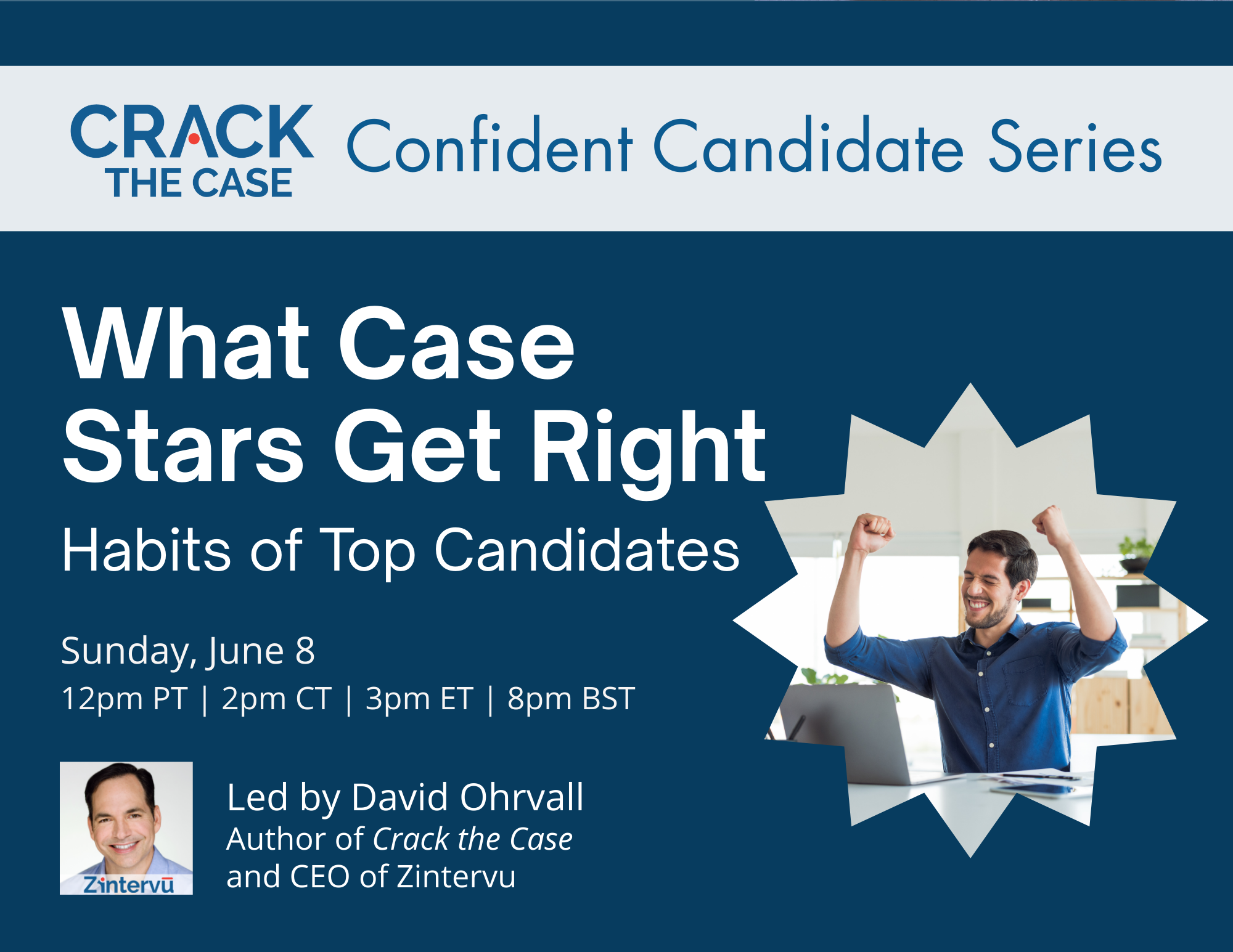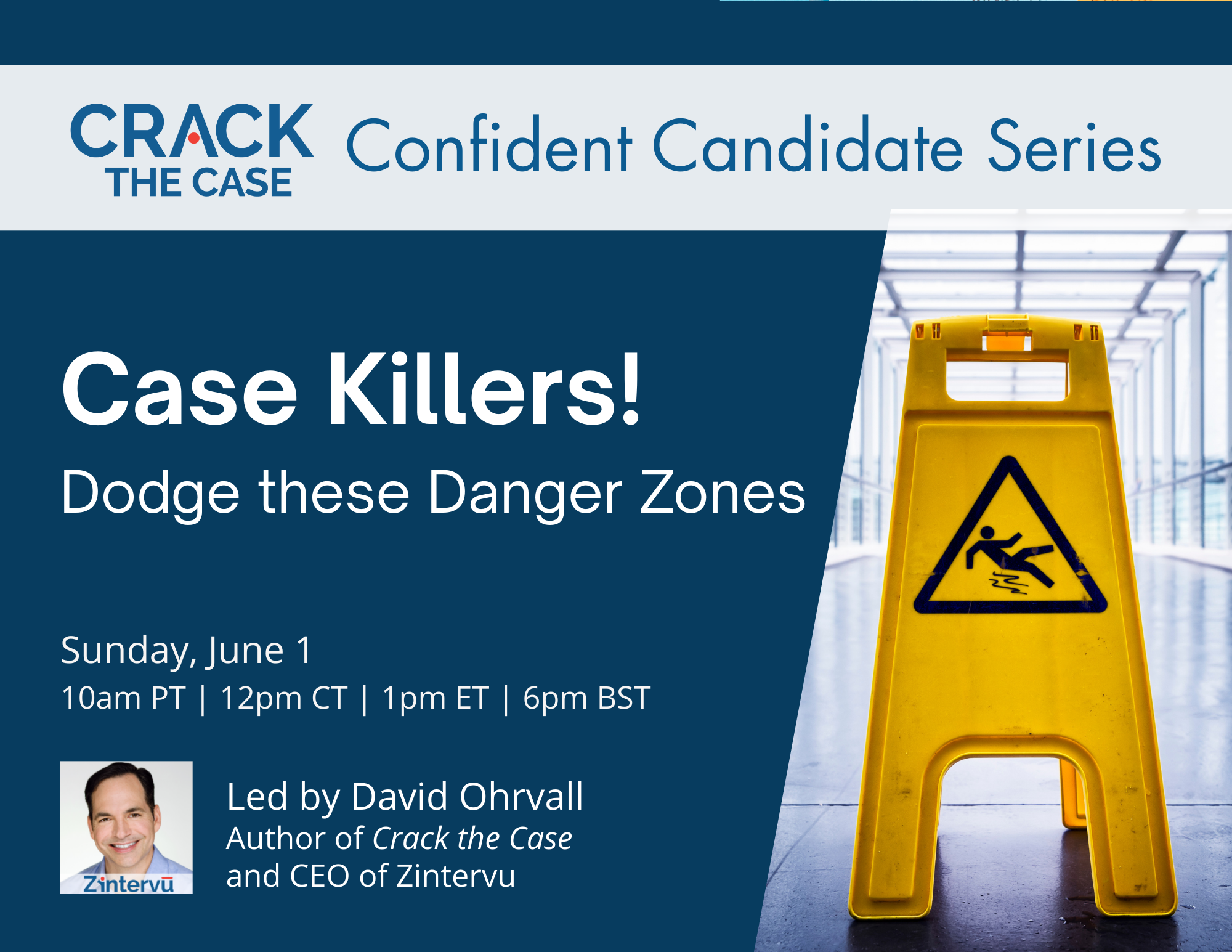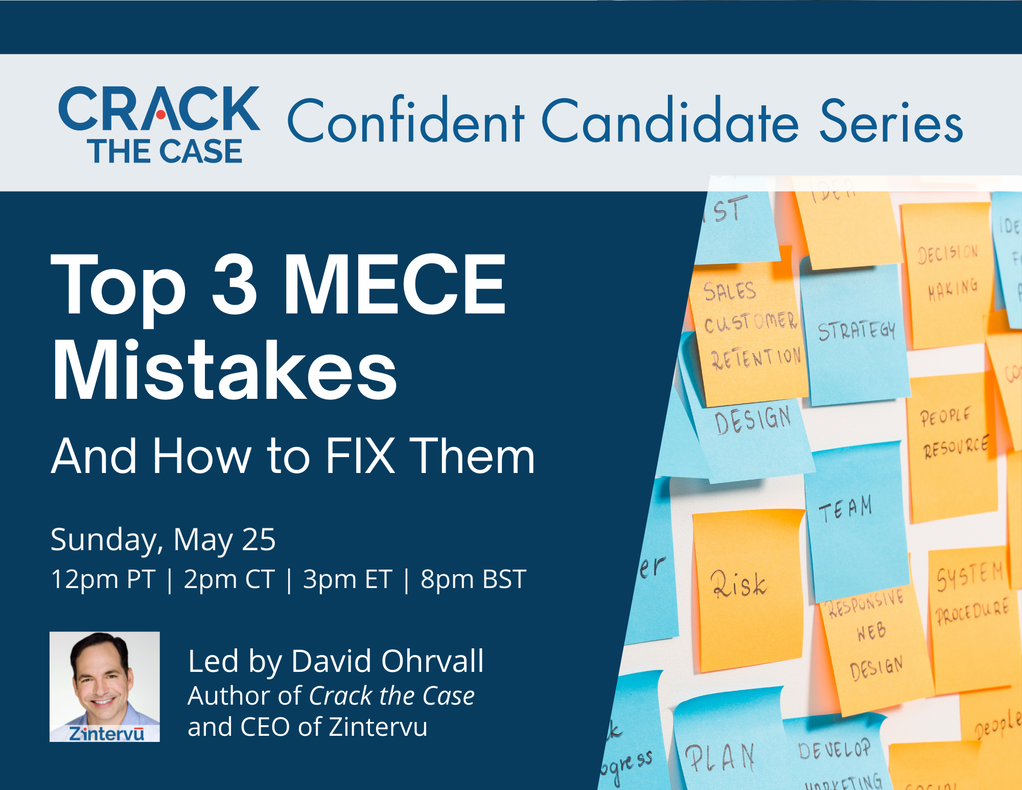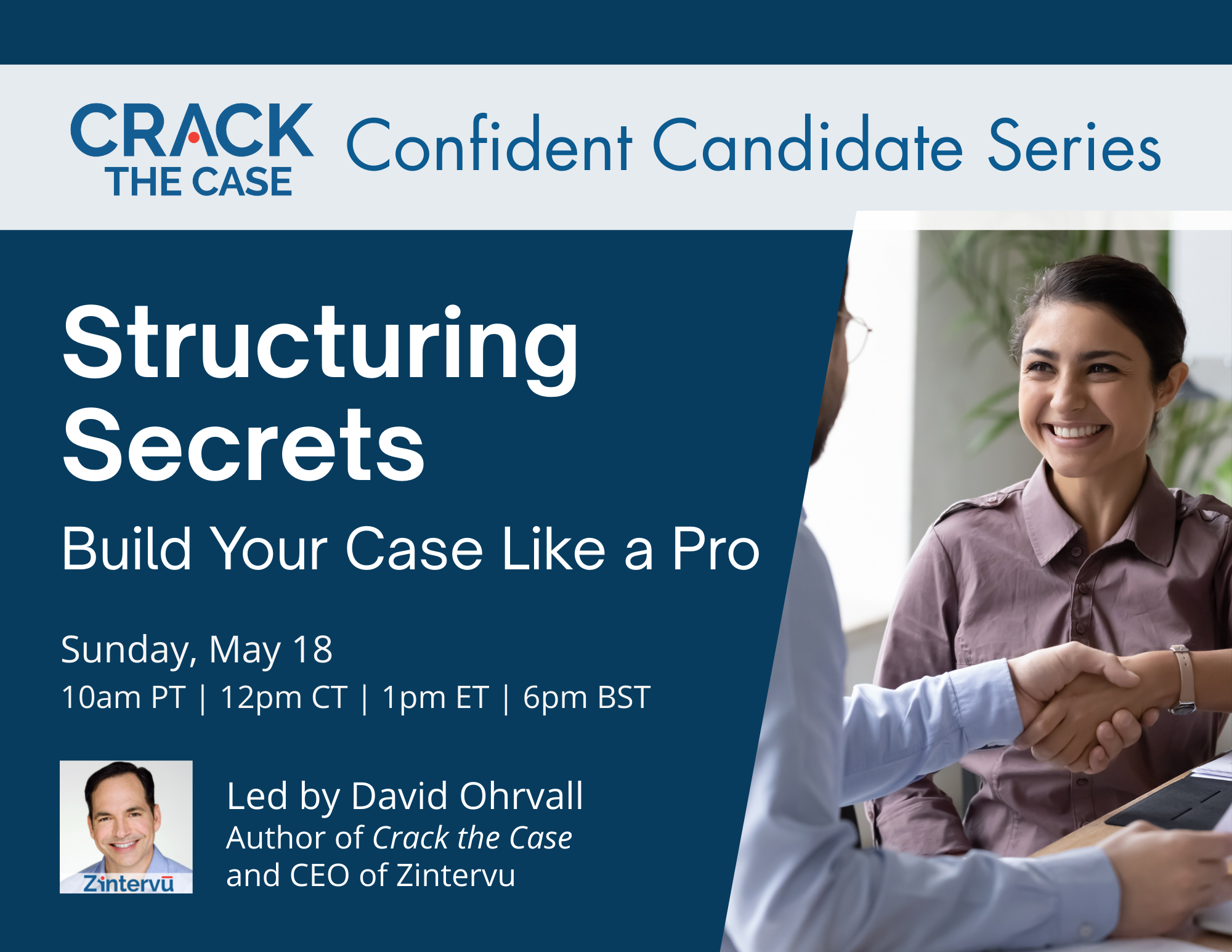 David is the CEO of Zintervu and the author of Crack the Case and Interview Logic. A dynamic and engaging speaker, David has trained tens of thousands of students at top business schools worldwide. David’s insider knowledge (as an ex-Bain & Company manager) and deep experience as an interview coach combine to bring you an outstanding learning experience that will enhance your problem-solving skills, logical communication, and personal presentation. Don’t miss this opportunity to take your case interviews to the next level!